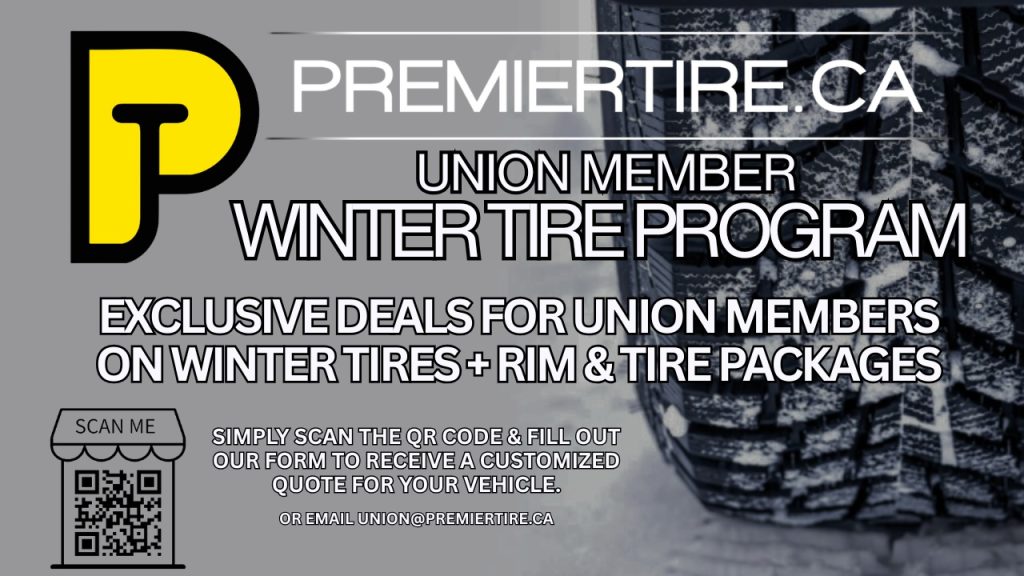 Exclusive deals for Union members on Winter Tires + Rim & Tire packages for the upcoming season. Simply fill out the Google form here or send an email to union@premiertire.ca to get a quote tailored to your vehicle.